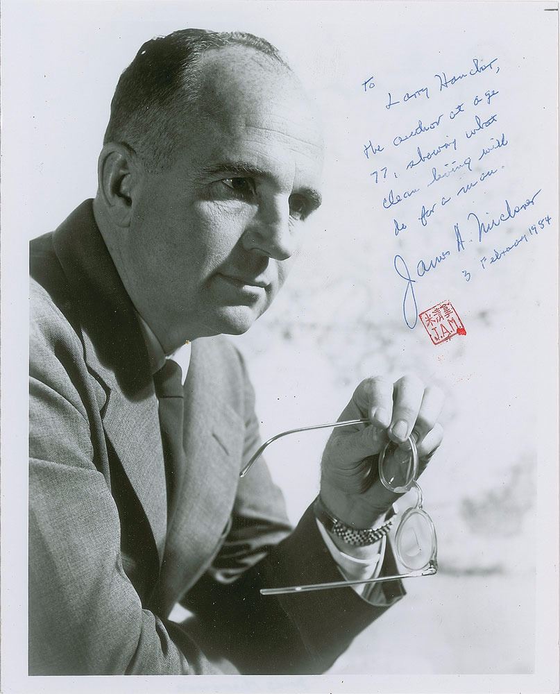 American author of frequent bestsellers (1907–1997) best known for Tales of the South Pacific, Hawaii, The Drifters, The Fires of Spring, Alaska, and others. Glossy 8 x 10 photo of the author holding his glasses, signed and inscribed in blue ballpoint, "To Larry Hancher, the author at age 77, showing what clean living will do for a man. James A. Michener, 3 February 1984," with his red chop stamp below. In fine condition.