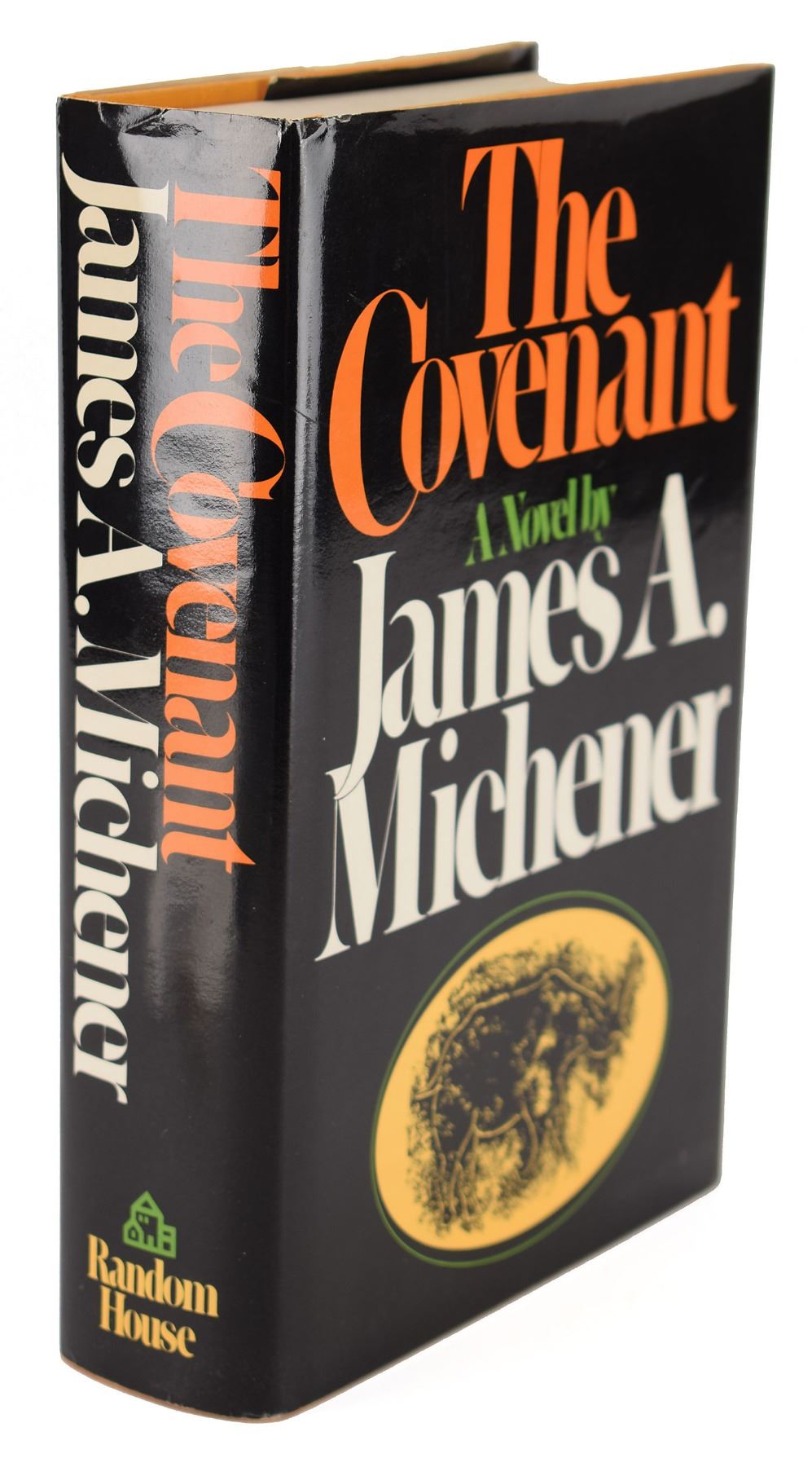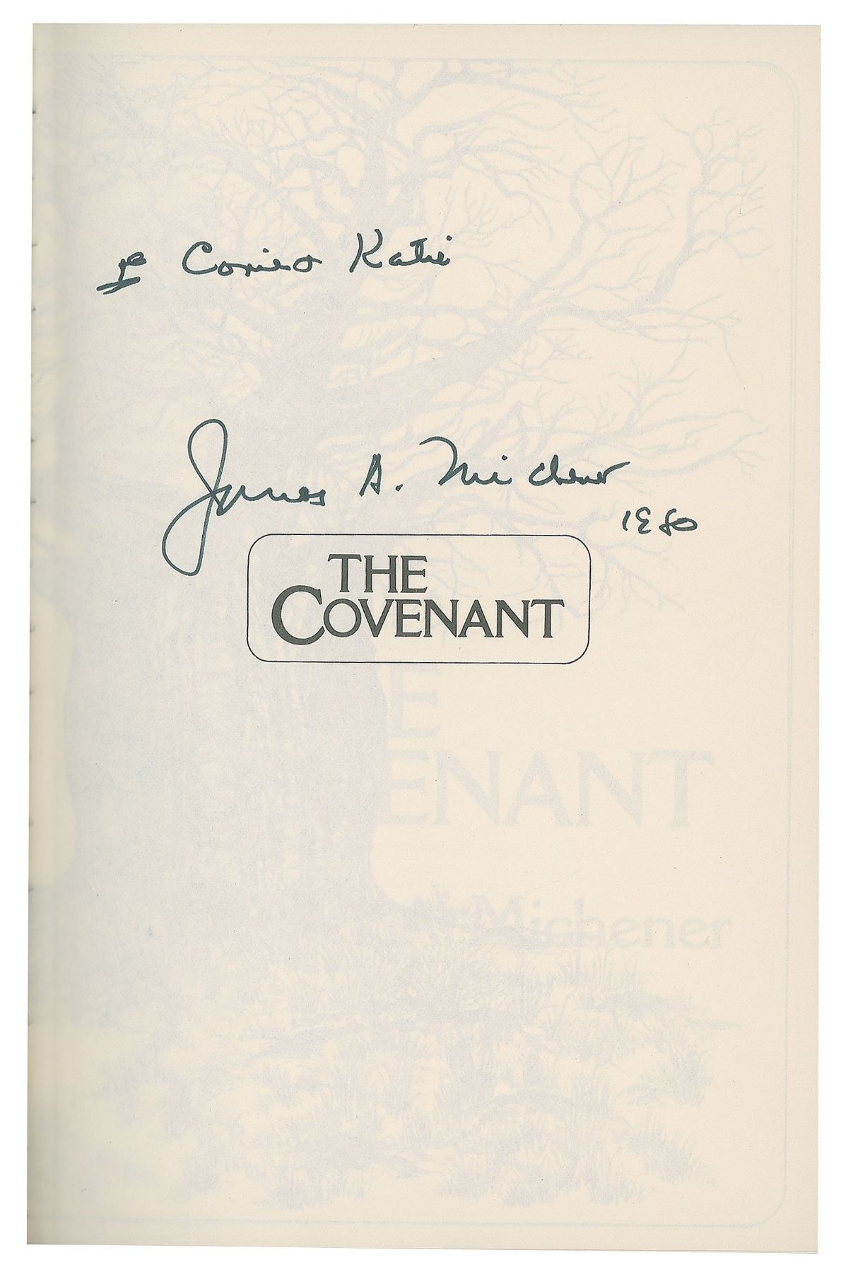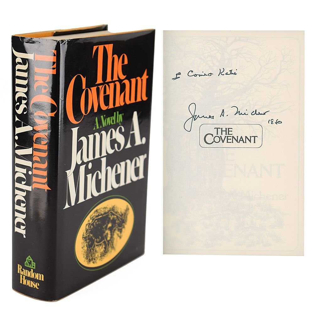 Signed book: The Covenant. Later printing. NY: Random House, 1980. Hardcover with dust jacket, 6.5 x 9.5, 873 pages. Signed and inscribed on the half-title page in black felt tip, "To Corie & Katie, James A. Michener, 1980." In fine condition.