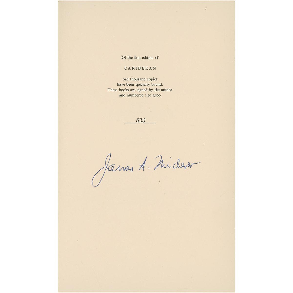 Signed book: Carribean. Limited edition first edition of 1000 copies (this being No. 533). NY: Random House, 1989. Hardcover with slipcase, 6.5 x 9.5, 672 pages. Signed on the limitations page in blue ballpoint. In very fine condition.