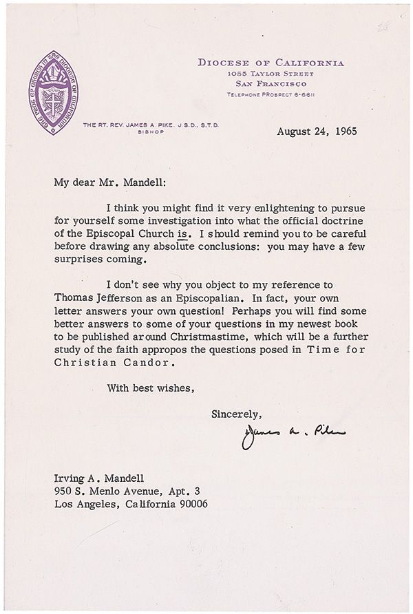 Episcopal bishop (1913–1969), and one of the first religious figures to appear regularly on television. TLS, one page, 6 x 9, Diocese of California letterhead, August 24, 1965. In part: “I think you might find it very enlightening to pursue for yourself some investigation into what the official doctrine of the Episcopal Church is. I should remind you to be careful before drawing any absolute conclusions: You may have a few surprises coming. I don’t see why you object to my reference to Thomas Jefferson as an Episcopalian.” In fine condition.