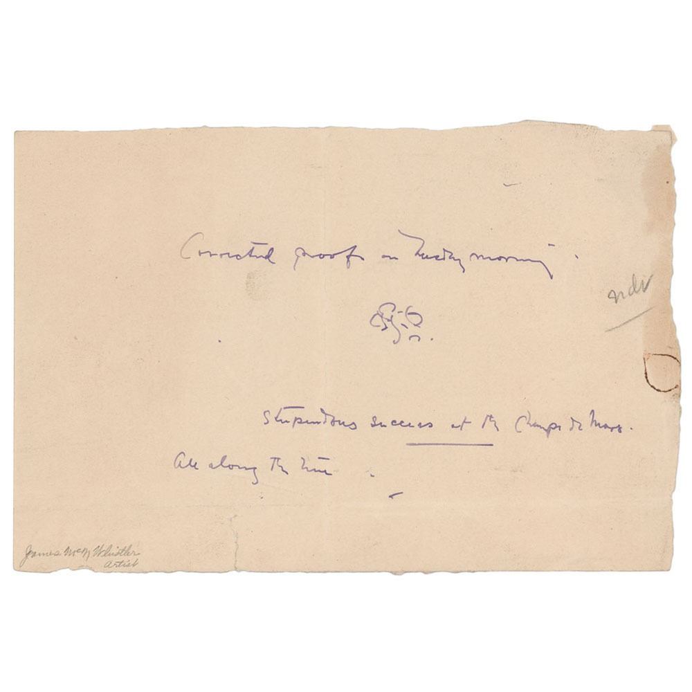 ANS signed with his 'butterfly' monogram, one page, 6.25 x 4.25, no date. Whistler's brief handwritten note reads: "Corrected proofs on Monday morning. [monogram] Stupendous success at the Champ de Mars. All along the line." In fine condition, with a short tear to the bottom edge, and a rusty paperclip impression to the right edge.