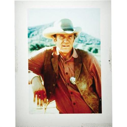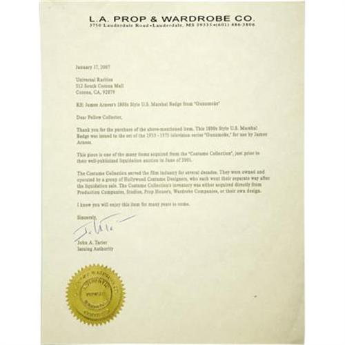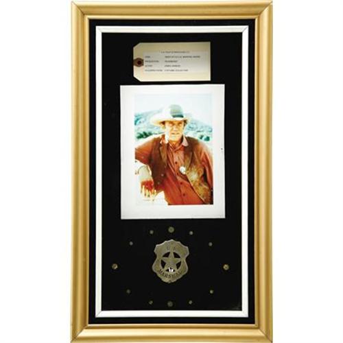 <B>James Arness Prop Badge from "Gunsmoke."</B></I> On the air from 1955 to 1975, "Gunsmoke" still stands as the longest-running prime time drama in the U. S., and James Arness played Marshal Matt Dillon throughout its 20-year run, the longest uninterrupted period any actor has played the same role in the same show in prime time. This U.S. Marshall's badge was one of several worn by Arness on the show, and was acquired from the CBS archives. A great piece of American entertainment history, in Excellent condition. <I>Accompanied by a COA from Hollywood Prop Supply.</B></I><BR><BR><b>Shipping:</b> Framed - with Glass, Small (<a target="_blank" href="http://www.heritageauctions.com/common/shipping.php">view shipping information</a>)
