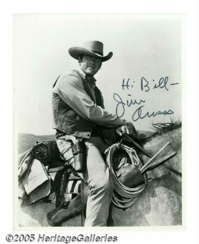 <B>James Arness Signed Photograph Plus Other Western Stars.</B></I> One of the actors most identified with that uniquely American genre of the Western, James Arness starred as Marshall Matt Dillon on the television series "Gunsmoke" for 20 straight years and 633 episodes (one of the longest runs in history), as well as in a series of made-for-television movies. Featured in this lot is a photo of Arness in the role of Marshall Dillon. Also included are signed photos of <B>Rod Taylor, John McIntire, Robert Mitchum, Sam Elliott, Ken Curtis, Ben Johnson, Iron Eys Cody, Rex Allen</B></I> and <B>Dennis Weaver.</B></I> <I>With COA from PSA/DNA.</B></I>