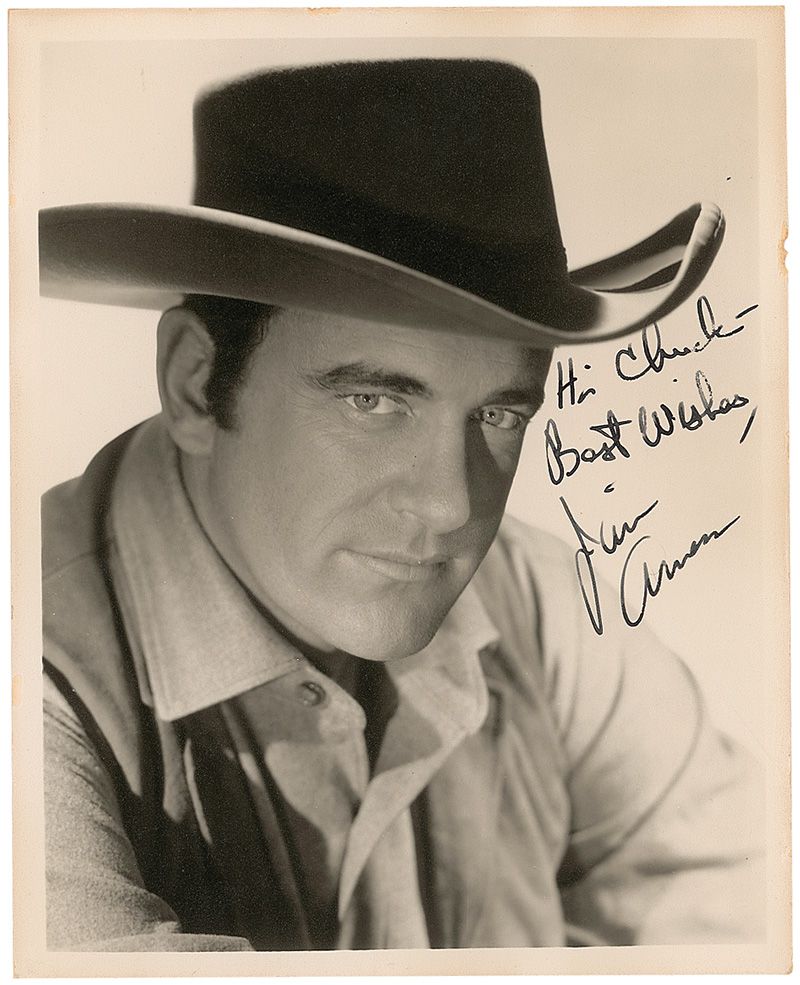 Vintage matte-finish 8 x 10 photo of Arness peering out from under his cowboy hat, signed and inscribed in fountain pen “Hi Chuck—Best wishes, Jim Arness.” In fine condition, with a ding to right edge, and a bit of scattered light trivial edge wear.