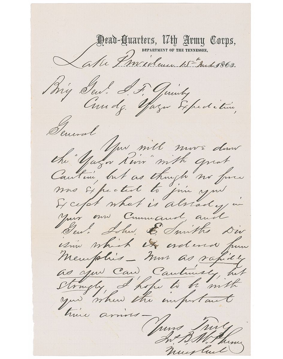 Career US Army officer (1828–1864) who served as a general in the Union Army and was killed in action at the Battle of Atlanta—the second highest ranking Union officer killed during the war. Civil War–dated ALS signed “Jas. B. McPherson, Maj. Genl.,” one page, lightly-lined, 5.25 x 8.25, Head-Quarters, 17th Army Corps, Department of the Tennessee letterhead, Lake Providence, March 15, 1863. Letter to Brigadier General Isaac F. Quimby. In full: “You will move down the ‘Yazoo River’ with great caution, but as though no force was expected to join you except what is already in your own command, and Genl. John E. Smith’s Division which is ordered from Memphis—move as rapidly as you can, cautiously, but strongly, I hope to be with you when the important time arrives.” In fine condition. This letter comes from the period of U.S. Grant’s Bayou Operations during the Vicksburg Campaign, in which he attempted to use or construct alternative waterways to position troops within striking distance of Vicksburg. At the time of writing, McPherson had been working on building a canal to connect the Mississippi to Lake Providence, allowing access to the Red River; he would declare the canal navigable three days later, but the boats sent to Grant were insufficient to move troops in the large quantities he desired. They would then turn to the Yazoo Pass Expedition, intending to use the Yazoo River to bypass the Vicksburg defenses and attack Fort Pemberton. The first flotilla made it down the river and began bombarding the fort, but soon determined that they were outmatched and began to retreat; Quimby arrived with his reinforcements on March 20, and convinced them to make another attempt to the same result. Autographic material from McPherson is quite rare, given his early death the following year at the Battle of Atlanta; with its excellent military content, this is an especially desirable letter.
