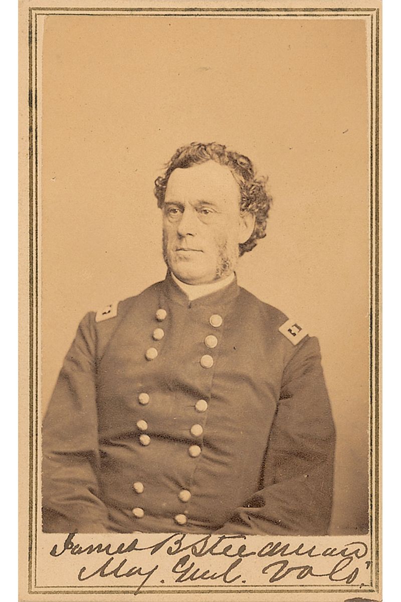 Union general (1817–1883) who served with valor at the Battles of Chickamauga and Nashville. Original 2.25 x 4 carte-de-visite photo by E. & H. T. Anthony of New York, signed in the lower border in black ink, “James B. Steedman, Maj. Genl. Vols,” In fine condition.