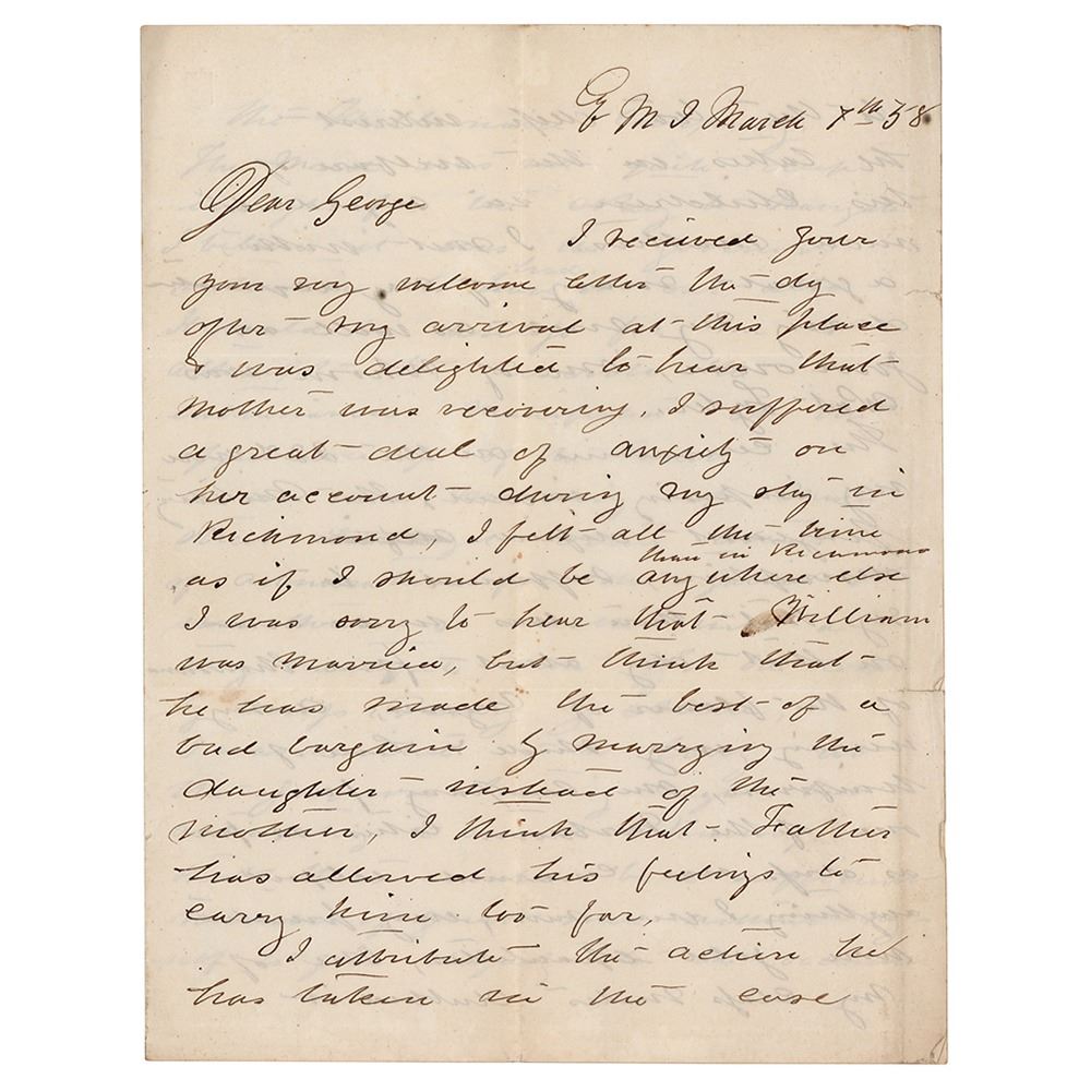Confederate general (1838-1864) who fought in nearly every major battle of the Eastern Theater, and was killed at the Battle of Totopotomoy Creek. His brother, Union officer William R. Terrill, also died in battle. Together, they came to epitomize the notion of 'brother against brother' during the Civil War. ALS signed "Jas. Barbour Terrill," four pages on two adjoining sheets, 6.25 x 8.25, March 7, 1858. Handwritten letter to his brother George, in part: "I received your very welcome letter…& was delighted to hear that mother is recovering. I suffered a great deal of anxiety on her account during my stay in Richmond…I was sorry to hear that William was married, but think that he has made the best of a bad bargain by marrying the daughter instead of the mother. I think that Father has allowed his feelings to carry him too far. I attribute the action he has taken in this case to the too deep interest he takes in the welfare of his children in regard to such matters…The ceremonies on the 22nd were very imposing indeed, the military Regiment defied description, sufficient to say that those…under arms on that day about four thousand of the flower of Virginia's Army wearing every shade & hue of uniform, the company from one of the Northern cities as far as dress was concerned eclipsed anything I ever saw…one of my classmates dubbed it the Millionaire Company…It would be useless for me to attempt to describe the enthusiasm manifested at the appearance of the Cadets as we were marching up Main Street amongst other tokens of admiration for the gallant." In fine condition, with intersecting folds, edge creasing, and a few small edge tears.