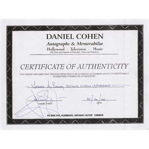 <B>James Bailey of the Barnum and Bailey Circus, 1897.</B></I> Joining the circus at age 14, James A. Bailey, born James McGinnis, eventually joined with Phineas T. Barnum to create the Barnum and Bailey Circus, which became "The Greatest Show on Earth." After Barnum died in 1891, Bailey managed the circus until his death in 1906, and the circus was then sold to Ringling Brothers. This signed document is six pages long, measure 8x12.5, and is dated June 29, 1897. The agreement between James A. Bailey, Ruth Louisa Bailey and Joseph T. McCaddon reads in part: "James A. Bailey is the sole owner and proprietor of the property and effects of the Barnum and Bailey Greatest Show on Earth, together with all the right, title, interest and property in the name of Phineas Taylor Barnum as a trade mark in connection with the said Circus and Menageries and also all the property and effects belonging to the late copartnership composed of Phineas Taylor Barnum, now deceased, and the said J.A. Bailey...J.A. Bailey has agreed to sell unto Ruth Louisa Bailey and Joseph T. McCaddon, each, an one hundredth interest in the aforesaid Show and property..for one dollar in hand...and also the conduct of other Show interests...such as the Buffalo Bill Wild West Exhibition...this partnership shall continue until the first day of January, 1900.." The document offers excellent signatures of all three parties at the bottom of page six, with red seals affixed beside the signatures of the Baileys. Fine condition, with faint scattered creasing and a horizontal fold through the signature of James Bailey, whose autograph is much rarer than Barnum's. Comes with Certificate of Authenticity. This is a wonderful item for enthusiasts of the circus and the Greatest Show on Earth! <I>Accompanied by a COA from Daniel Cohen, noted authograph authenticator.</B></I>