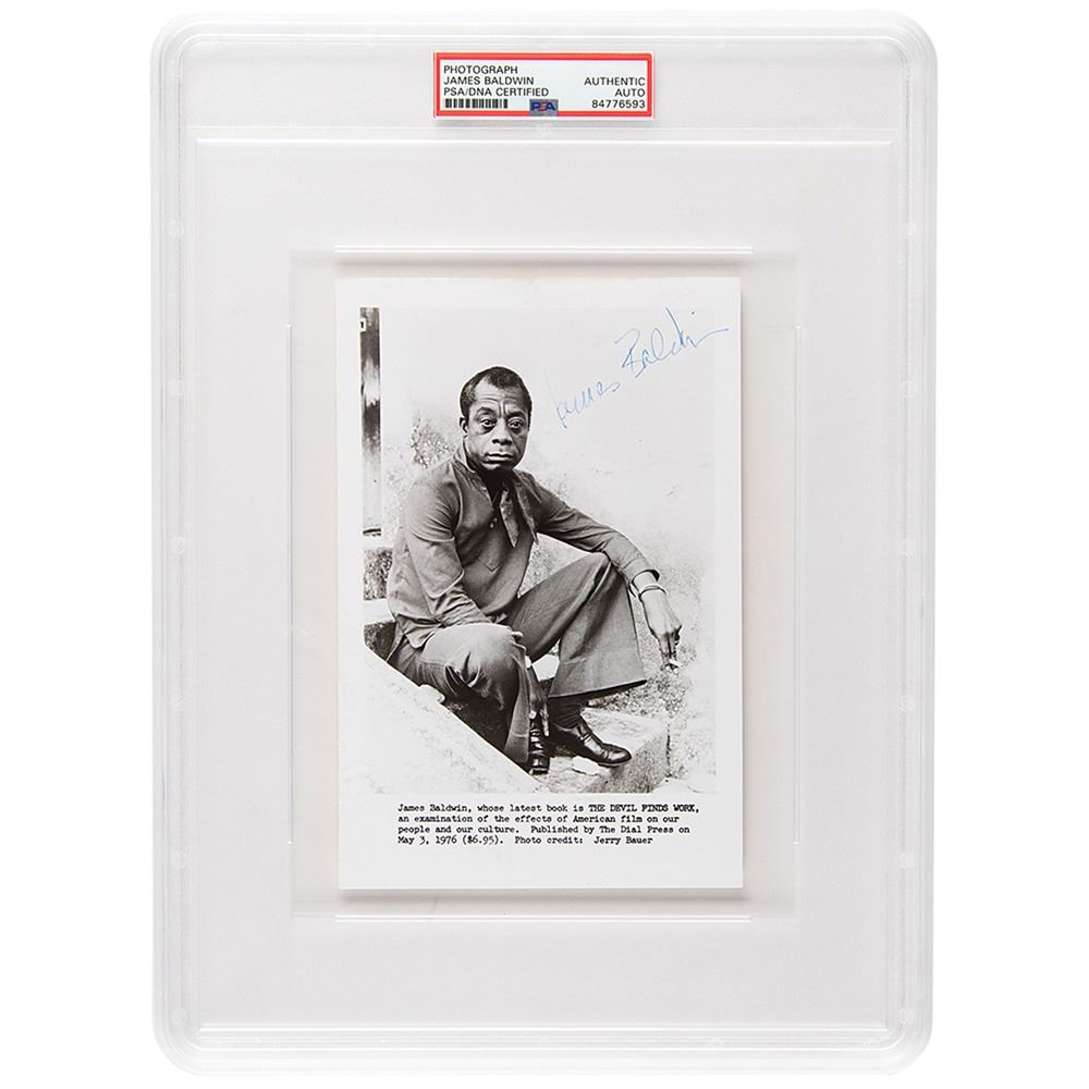 Glossy 5 x 7.5 publicity photo of James Baldwin for his 1976 book The Devil Finds Work, signed in blue ballpoint. In fine condition, with light crazing to the emulsion. Encapsulated in a PSA/DNA authentication holder.