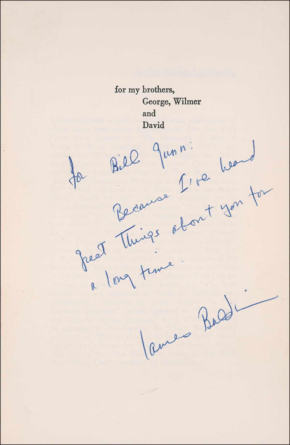 Author of Go Tell It on the Mountain and other books on the black experience in America. Signed book: Nobody Knows My Name. Later printing. NY: Delta Publishing, 1961. Softcover, 5.25 x 8, 241 pages. Signed and inscrbed on the dedication page, “For Bill Gunn: Because I’ve heard great things about you for a long time. James Baldwin.” In fine condition, with mild page toning, and a partial separation to front cover along fragile spine.
