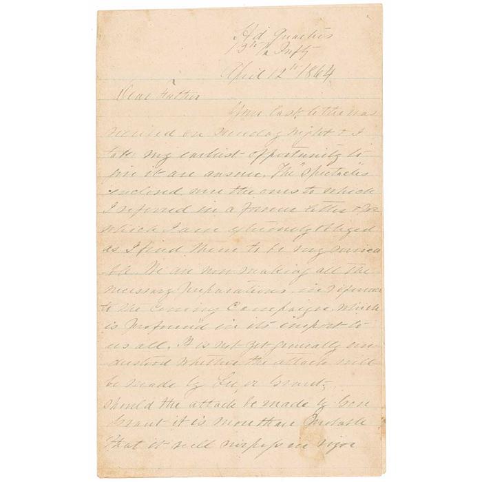 “It is not yet generally understood whether the attack will be made by Lee or Grant – should the attack be made by Gen. Grant it is more than probable that it will surpass in size anything of the kind in which the ‘army of Northern VA’ has ever participated. Gen. Early has expressed his intentions to push my regiment ‘on up to the hat-band.’ We will all however have our full share of whatever may occur. My regiment will be at least (350) strong excluding recruits.
