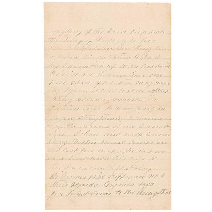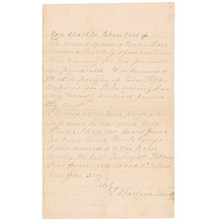 “The Engineer Corps is now busily engaged strengthening and increasing the defenses of our present lines. I have met with Cousin Terry Morton several times in the last few weeks, he is now on a visit with his wife to his son in law. Capt. Halsey, Dr. Grymes and Col. Huffman send their regards. Grymes says you must come to the Army that you shall be taken care of. The recent excessive rains have rendered military operations in this vicinity for the present impracticable. It is rumored that a portion of Gen. Polk’s corps is in this vicinity passing secretly around from the west. I received a letter from George a few days since he was quite well Phillip I have not heard from for some time. Uncle George I also received a letter from during the last fortnight.” In very good condition, with light creasing and wrinkling, several intersecting folds (a couple lightly affecting the signature), light overall toning and a few light stains, all writing a shade or two light but completely legible.