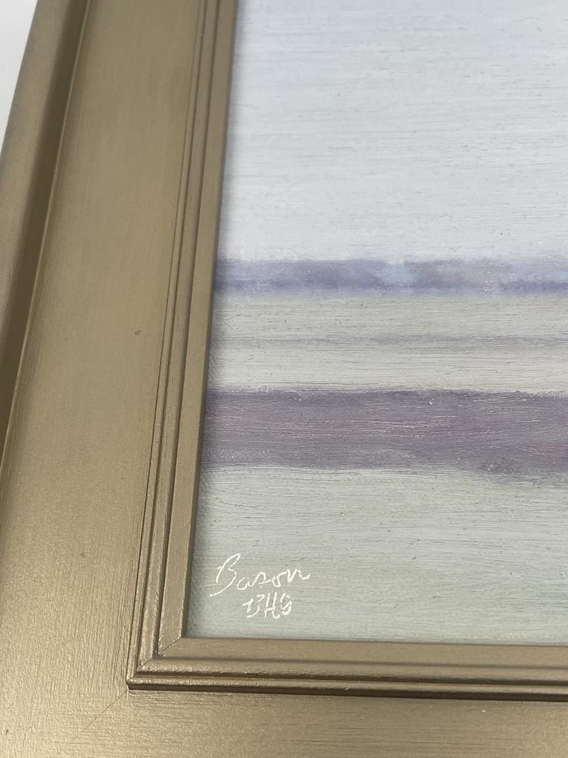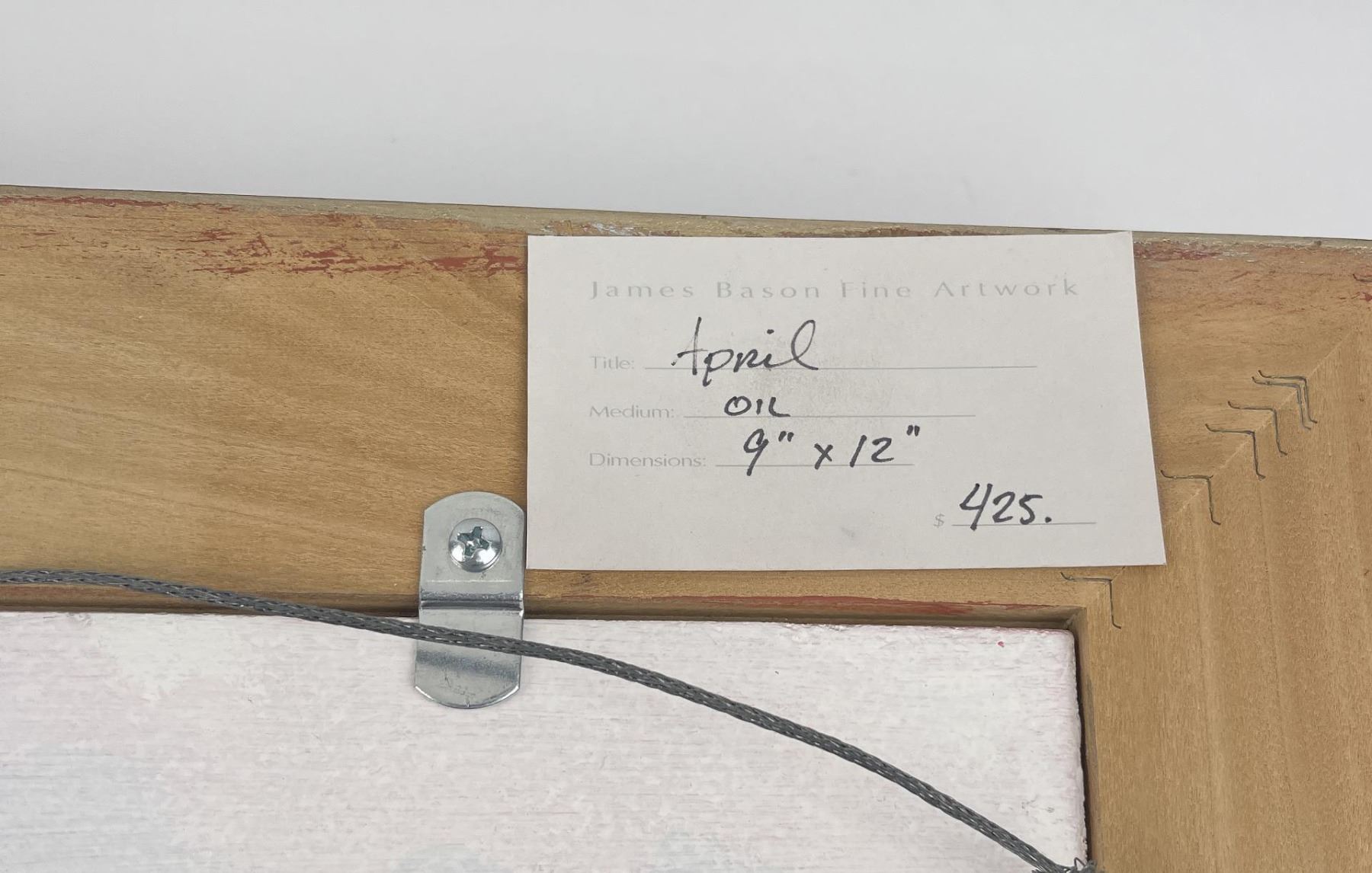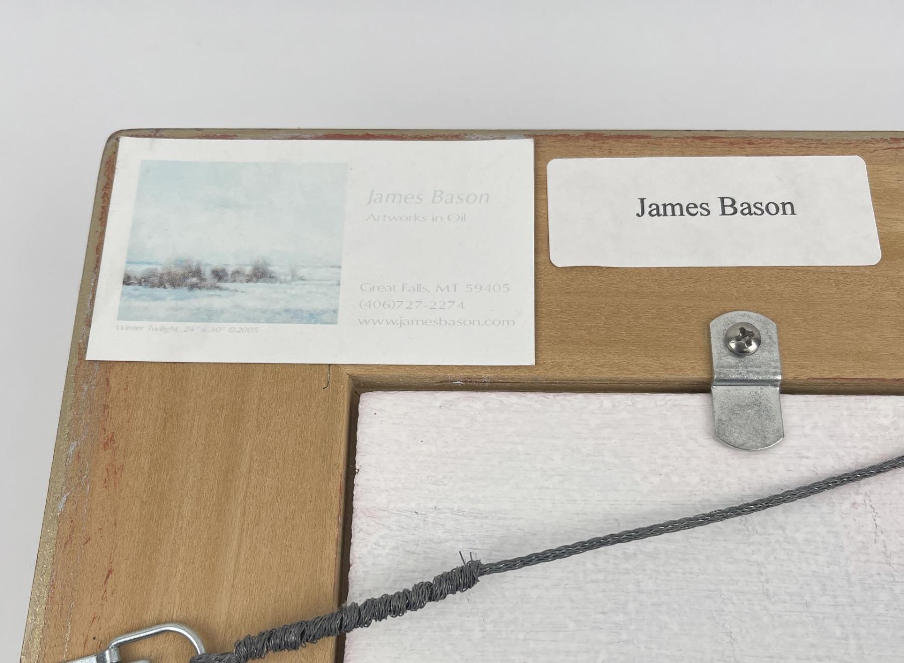Very nice plein air painting. 13.5" by 16.5" framed. James Bason paints what he grew up with - not the majestic mountain peaks so common and popular in western art but more often than not the vast open prairie, the windy vista or simply the space in between things - a clump of grass, some willows, the clouds of Montana’s big sky. He is a native Montanan best known for his serene and soft edged landscape paintings of central Montana. He received a Bachelors in Art Degree with Honors from Montana State University at Bozeman in 1996 with concentrations in both graphic design and painting. He has exhibited for numerous years at the annual C. M. Russell Art Auction, Paris Gibson Square Museum of Art Auction, Western Masters Art Show, The Jay Contway and Friends Art Show and the Yellowstone Art Museum Auction as well as various art shows and auctions throughout the state.