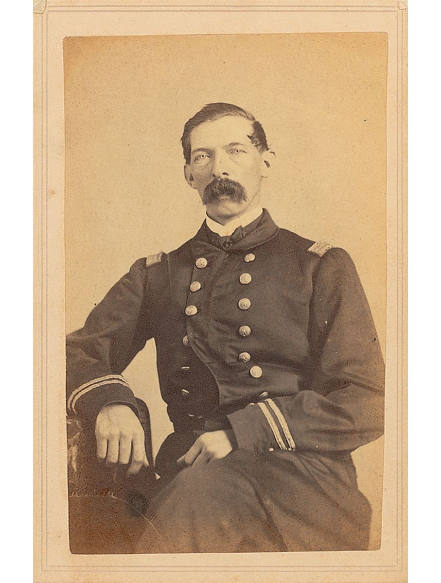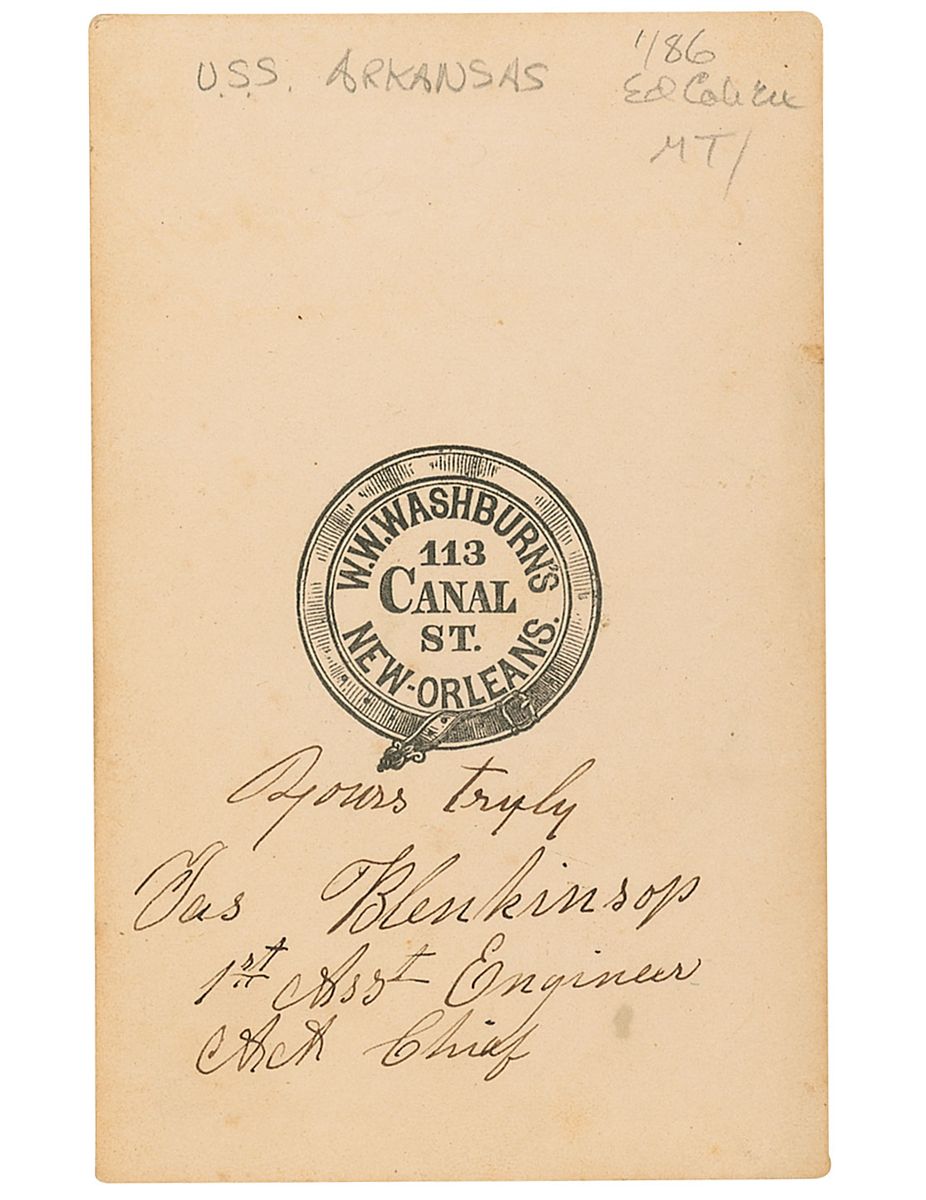 Third assistant engineer on board the steamer Massachusetts. Original 2.25 x 4 carte-de-visite photo by Washburn’s of New Orleans, signed on the reverse in black ink, “Yours truly, Jas. Blenkinsop, 1st Asst. Engineer, Act Chief.” In fine condition, with a bit of light soiling on reverse and a couple light pencil notations.