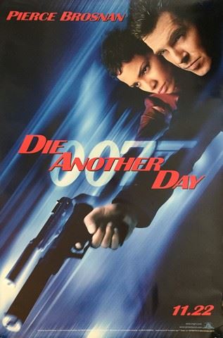 James Bond 007 Die another Day (2002) rolled poster featuring a photo of Bond (Pierce Brosnan) and Jinx (Halle Berry) and the release date of 11.22. (27"x41"). Some creases and ripples down the edges.