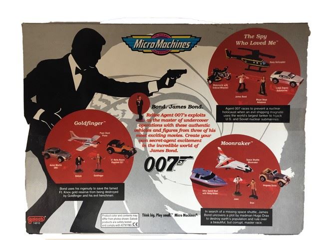 James Bond 007 branded Micro Machines scale miniature collectibles from Galoob Toys 1995. Relive Agent 007's exploits as the master of the undercover operations with these authentic vehicles and figures from three of his most exciting movies. Create your own secret agent excitement in the incredible world of James Bond.