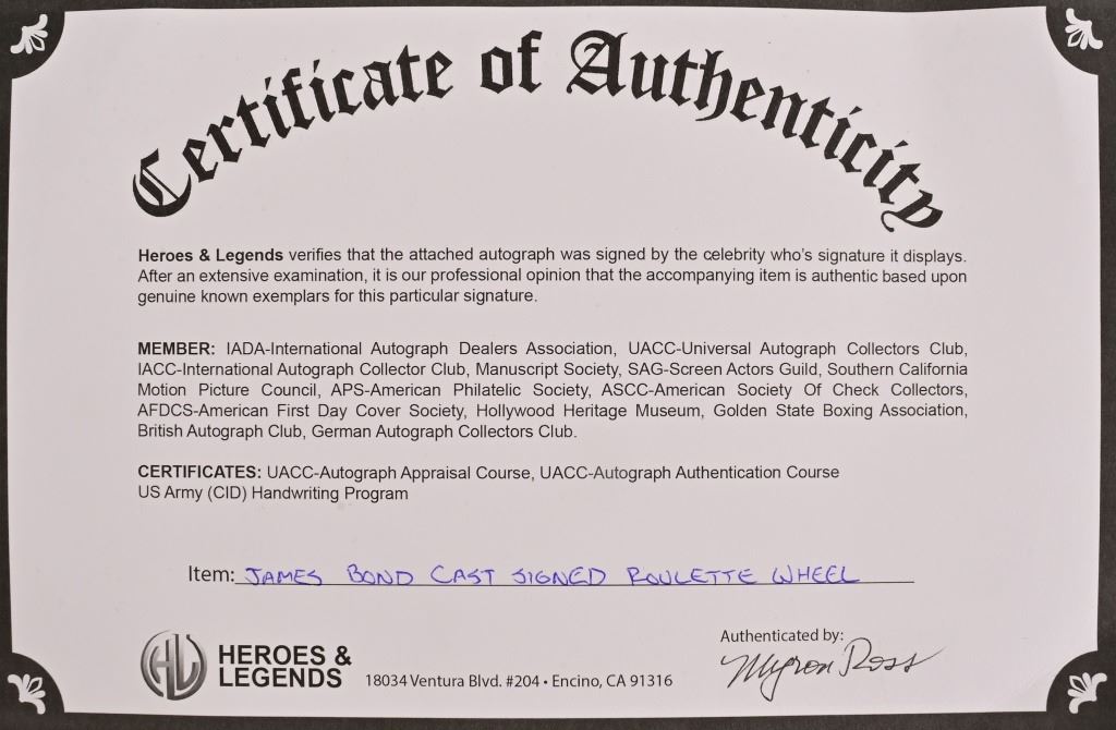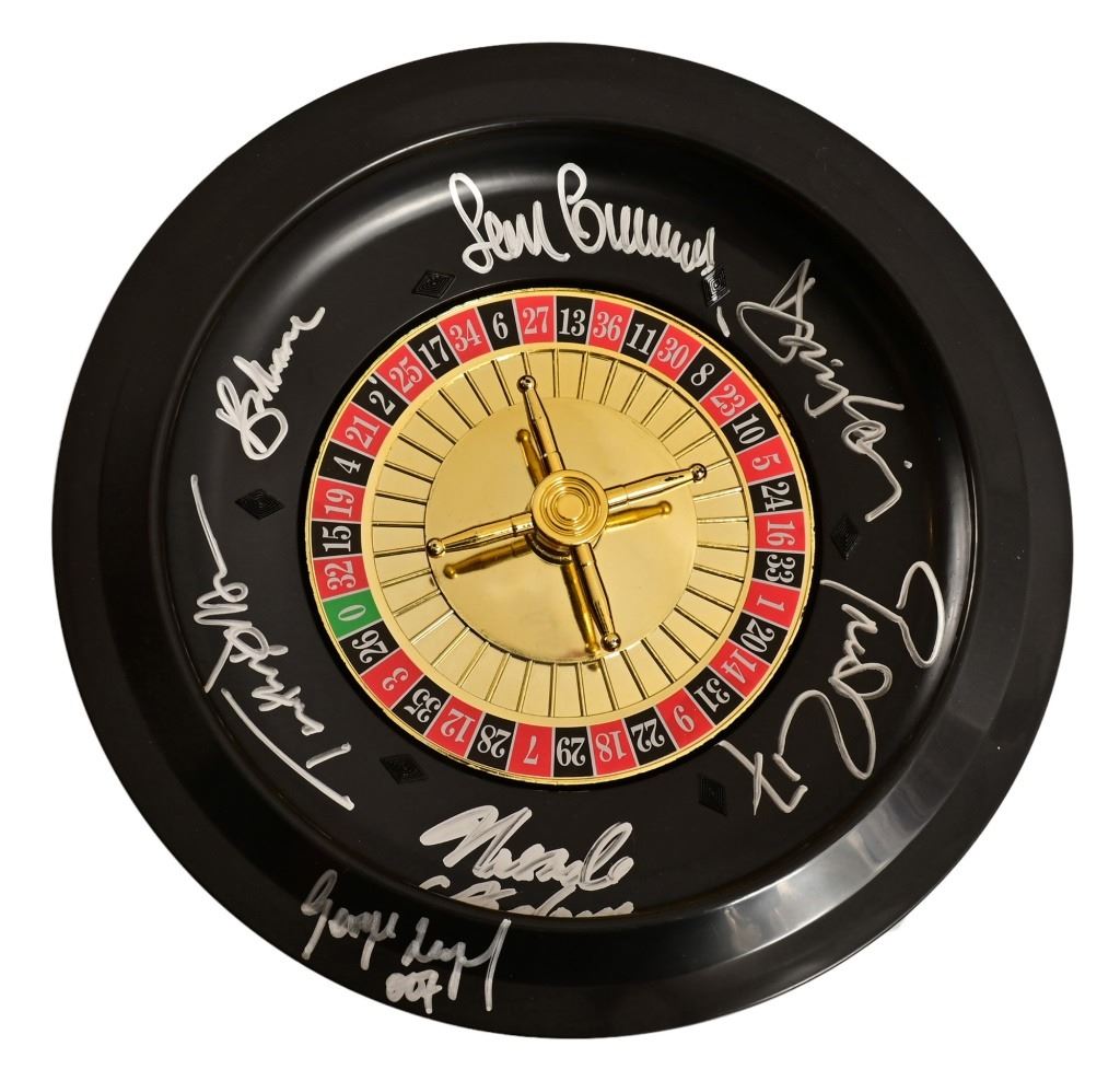 James Bond cast signed roulette wheel autographed by Sean Connery, Roger Moore, George Lazenby, Timothy Dalton, Pierce Brosnan and Daniel Craig. 10 inches. HL20323