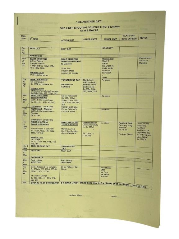 Original Shooting Schedule used on the production of 'Die Another Day' (2002), where James Bond is sent to investigate the connection between a North Korean terrorist and a diamond mogul, who is funding the development of an international space weapon.