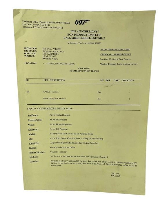 Original Shooting Schedule used on the production of 'Die Another Day' (2002), where James Bond is sent to investigate the connection between a North Korean terrorist and a diamond mogul, who is funding the development of an international space weapon.