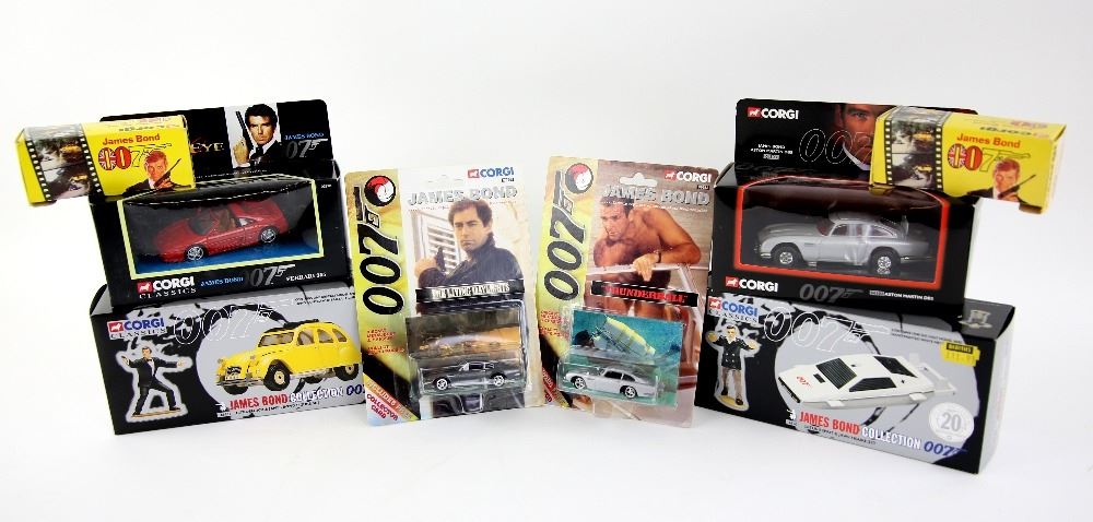James Bond - Die Cast cars including Corgi Citroen 2CV x 2, Corgi Classics Lotus Esprit & Jaws, Citroen 2CV & James Bond, GoldenEye Ferrari 355, Aston Martin DB5 & two other cars.