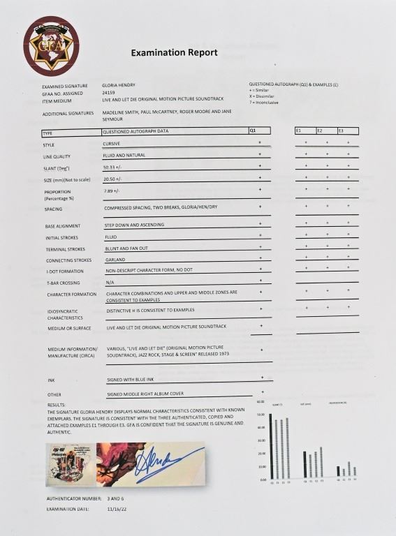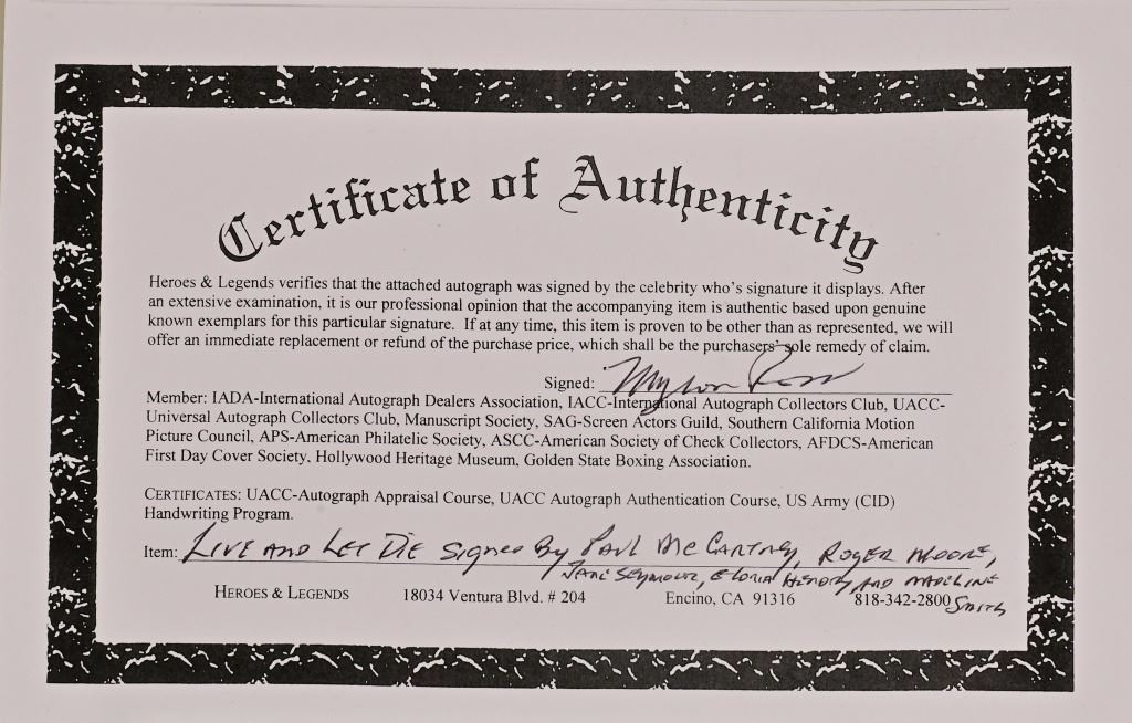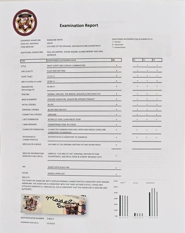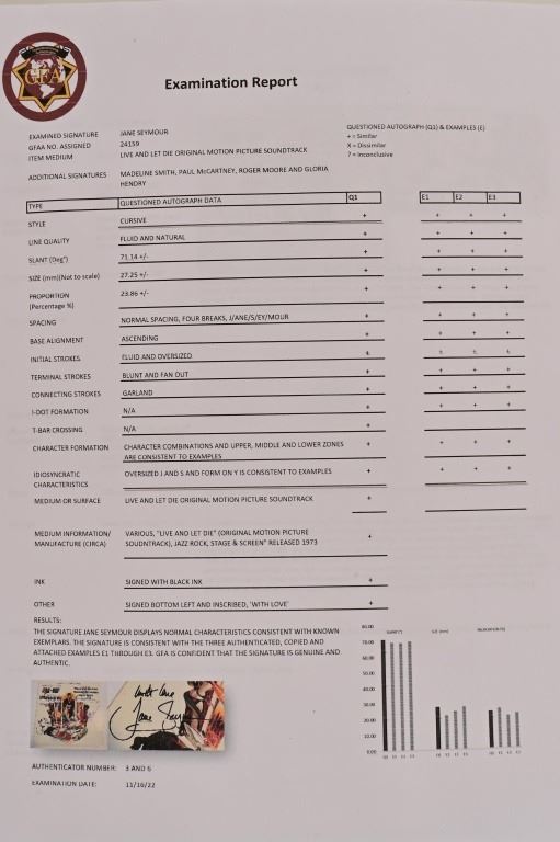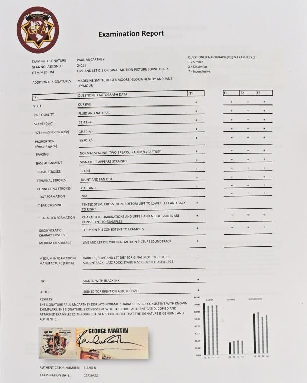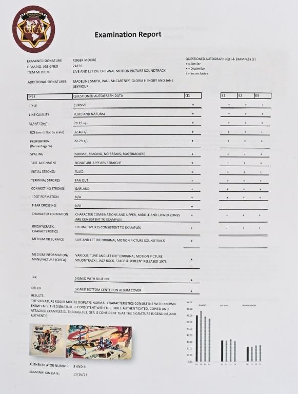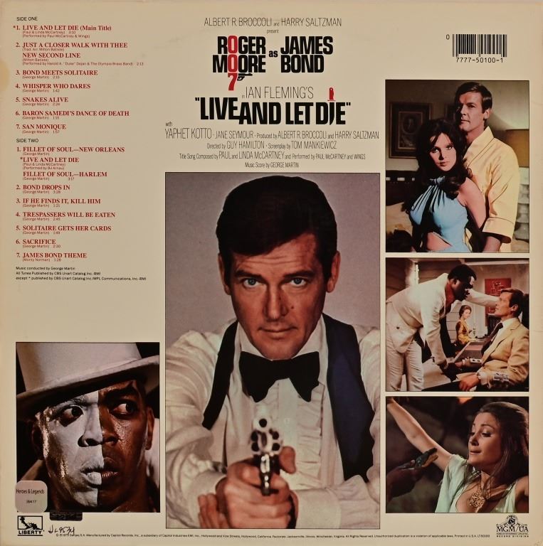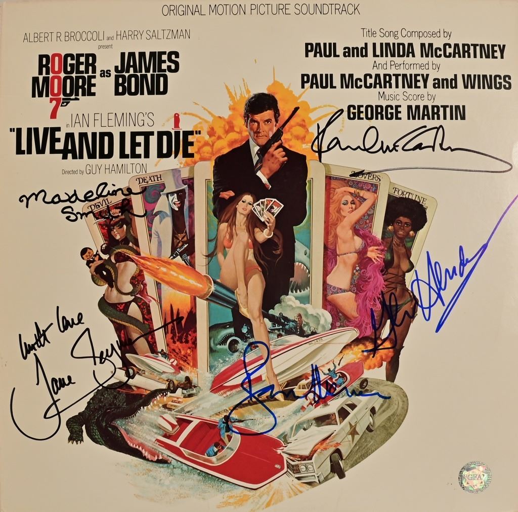 James Bond Live and Let Die original soundtrack signed by Roger Moore, Jane Seymour, Madeline Smith, Paul McCartney and Geoffrey Holder. 12x12 inches. GFA Authenticated. PSJ172