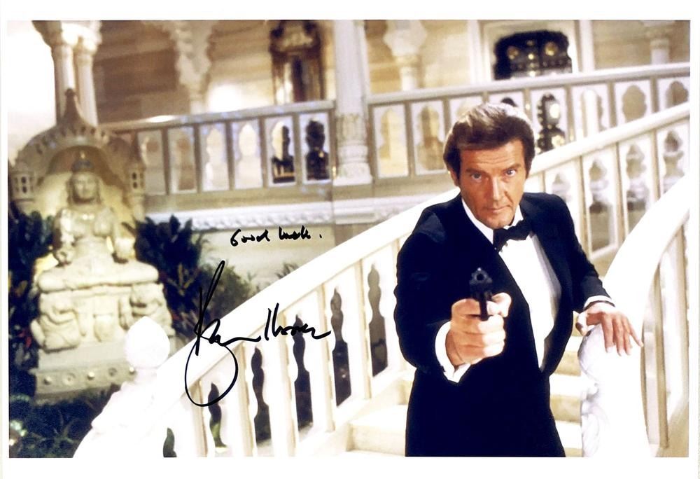 James Bond Roger Moore facsimile signed movie photo. 8x10 inches. This item is a reprint of an original autograph