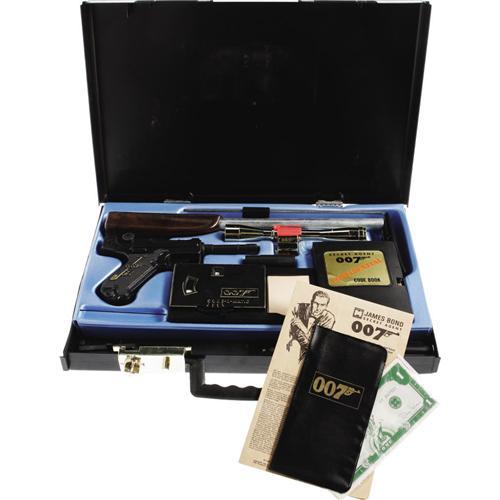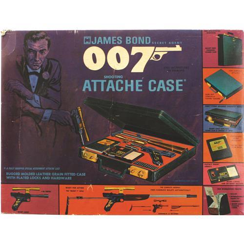 <B>James Bond Secret Agent 007 Attache Case (Multiple Toymakers, 1964).</B></I> Spend the day playing with spyware, chasing imaginary Russian spies, and saving the world with this cool toy! You'll have everything you need with this fully equipped special assignment attache case, which features a secret agent pistol with silencer and scope, a code book, fake money, and passports, and the black case with a combination lock that will "blow up" if a foreign spy enters the wrong combination (it sets off a paper cap). The box has some edge wear, but the items are all included, and overall, the whole toy is in Very Good condition. <BR><BR><b>Shipping:</b> Large Collectibles (<a target="_blank" href="http://www.heritageauctions.com/common/shipping.php">view shipping information</a>)