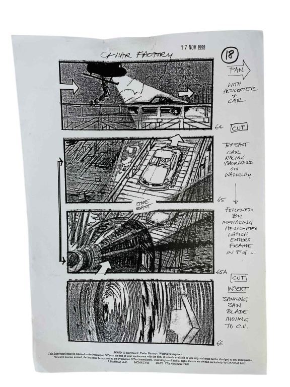 Storyboard Sheet (production used copy) used in the production of the Michael Apted directed spy film 'The World is Not Enough' (1999), where James Bond uncovers a nuclear plot when he protects an oil heiress from her former kidnapper, an international terrorist who can't feel pain.