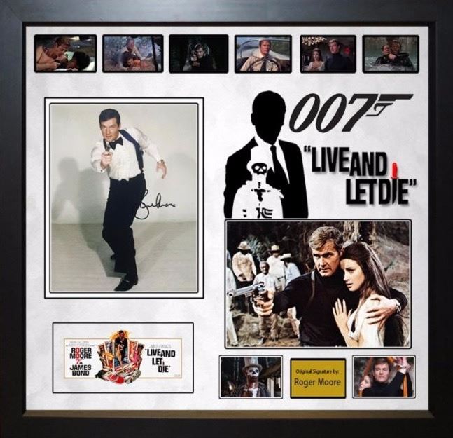 Roger Moore signed James Bond collage. This item is custom framed and authenticated by PSA DNA. This item comes with a Certificate of Authenticity from a third party authenticator. This Certification of Authenticity does not imply that the item will be certified by any other rival authentication companies. The accompanied certification is the only certification the auction company can confirm. These items are being sold as collectable pieces and there is no guarantee that this item can be resold on any online marketplace. Each of these companies has their own policies and politics.