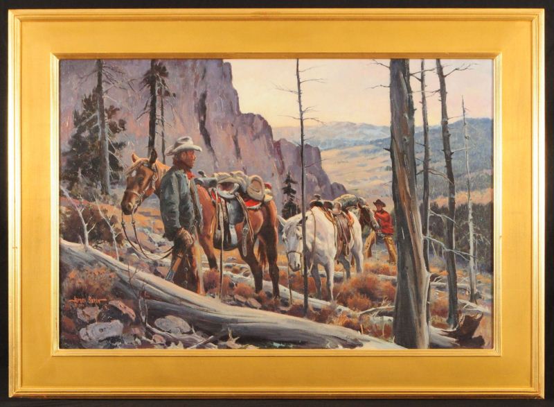 Measures 24" x 36". A noted watercolor and oil painter of western scenes and member of the Cowboy Artists of America, James Boren was born in Waxahatchie, Texas, the son of a minister, and from 1971, he lived in Clifton, Texas. Because of the influence of his father, he continued to regard himself as a religious person. He knew as a teenager that he wanted to be an illustrator but his schooling at Southwestern College was interrupted by four years of military service in the Marines during World War II. After the war in 1951, he earned his M.F.A. from the Kansas City Art Institute and then taught for two years at St. Mary's College. With his earnings, he traveled the Southwest and also painted in Alaska, and in 1956 moved to Denver where he worked as a concept illustrator for the Martin Company. In 1959, he began selling cowboy paintings, and in 1964, he became the first Art Director of the Cowboy Hall of Fame in Oklahoma City. He loved that job because he met so many of the artists he admired. He first exhibited there in 1969, having become a full-time