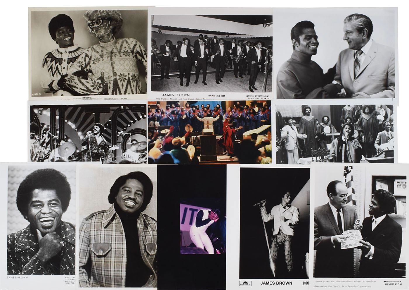 Group of 11 different photos of Brown, 8 x 10 and 10 x 8, mostly glossy, including: a promo still from the 1965 film Ski Party; a 1966 promo shot with Vice President Hubert Humphrey; a 1967 promo action shot with Brown, his orchestra, and The Famous Flames; a satin-finish Polydor promo shot of Brown on stage; a one-of-a-kind 1967 color action shot on stage; a rare 1968 shot of Brown with Los Angeles Mayor Sam Yorty; a 1971 promo shot from Brown’s Augusta offices; a 1974 action shot from TV’s Soul Train; a 1974 casual studio promo shot; a 1980 cardstock promo still from the film The Blues Brothers; and a 1980 glossy promo shot from the film The Blues Brothers. In overall fine condition.