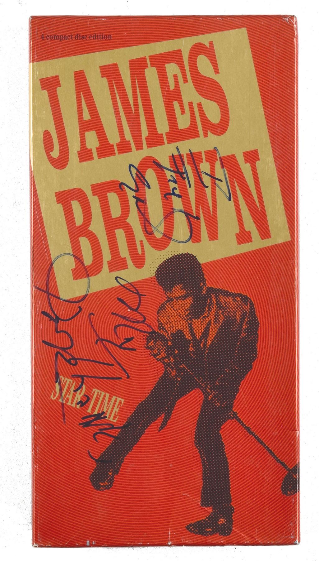 James Brown Star Time CD box set, 6 x 12.25 x 1.5, signed on the cover in blue felt tip, "I feel good, My Thanks, James Brown." In fine condition, with some creasing near Brown's feet. The CDs are not included.