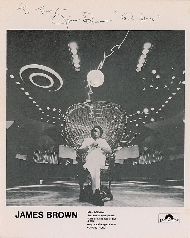 Cardstock 8 x 10 publicity photo, signed and inscribed in the top border in black felt tip “To Tommy—James Brown ‘God Bless.’” In fine condition, with light overall irregular ink adhesion to signature and inscription.