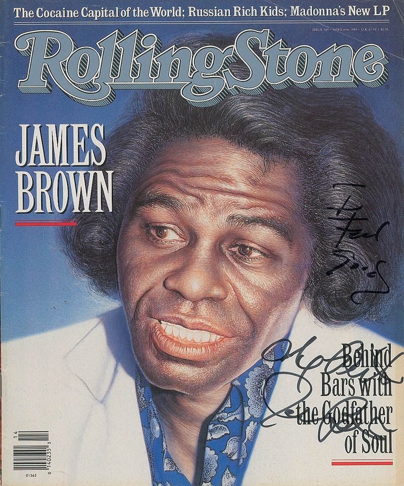 Rolling Stone magazine, dated April 6, 1989, featuring Brown on the cover, signed on the front cover in black felt tip, “I Feel Good, My best, James Brown.” In fine condition, with some light contrast to portions of sentiment.