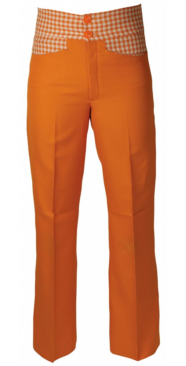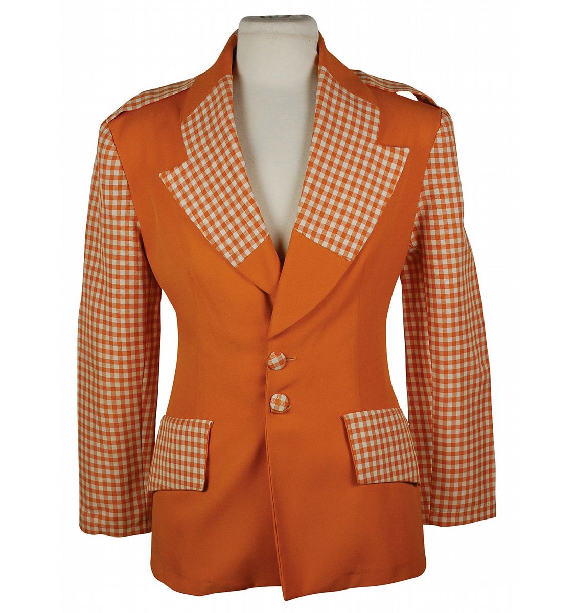 One of Brown’s personally owned and worn suits. Custom-made two-piece orange checkered suit consists of a single breasted jacket with two buttons and a matching pair of orange slacks with a checkered waistline. In fine condition. Accompanied by a certificate of authenticity from Tracks. Provenance: Christies, The James Brown Collection, July, 2008.