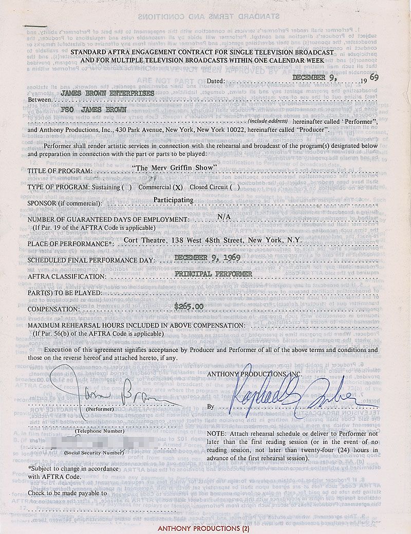 DS, one page, 8.5 x 11, December 9, 1969. Standard AFTRA contract in which Brown agrees to appear on The Merv Griffin Show on the same day in exchange for $265. Signed at the conclusion in ballpoint by Brown. A standard AFTRA rider is stapled to the main document in the upper left. In fine condition, with expected document wear.