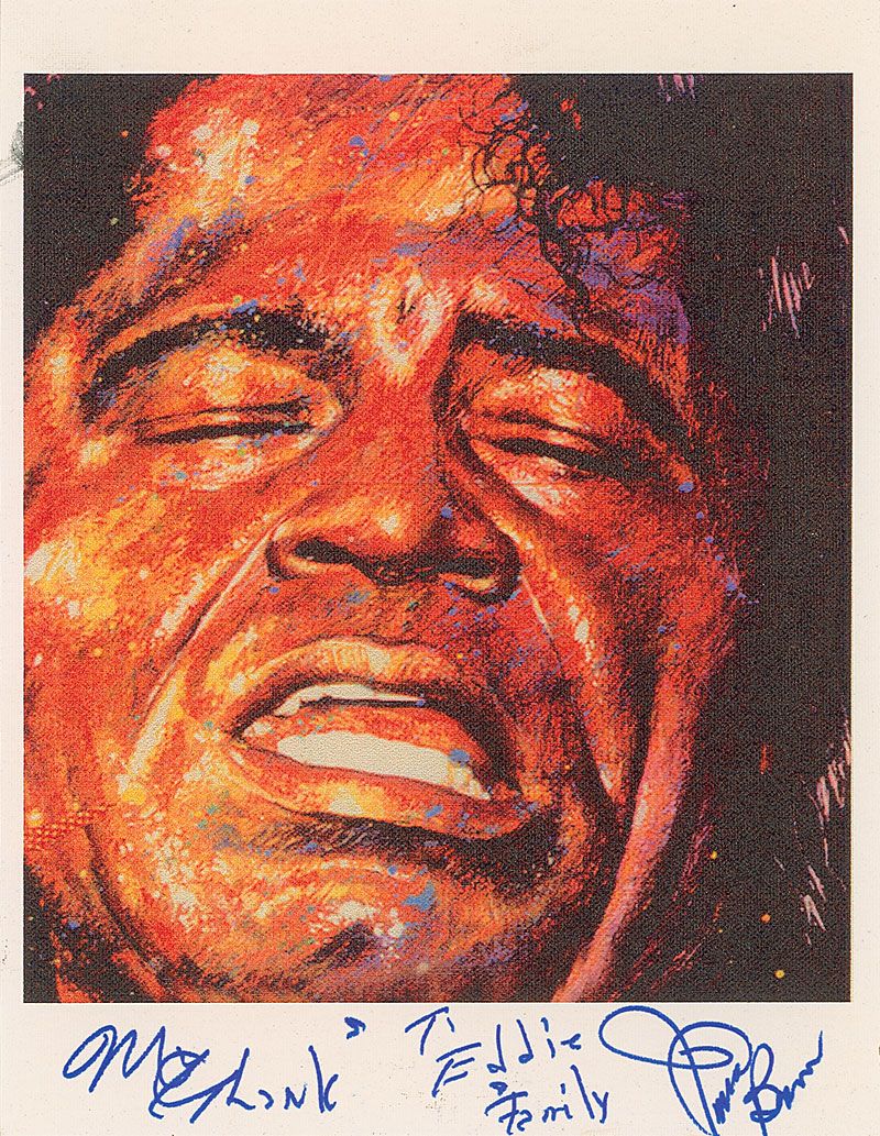 Color 8.5 x 11 print on canvas of an artist’s depiction of Brown’s face, signed and inscribed in the lower border in blue felt tip, “My thanks to Eddie & Family, James Brown.” In fine condition.