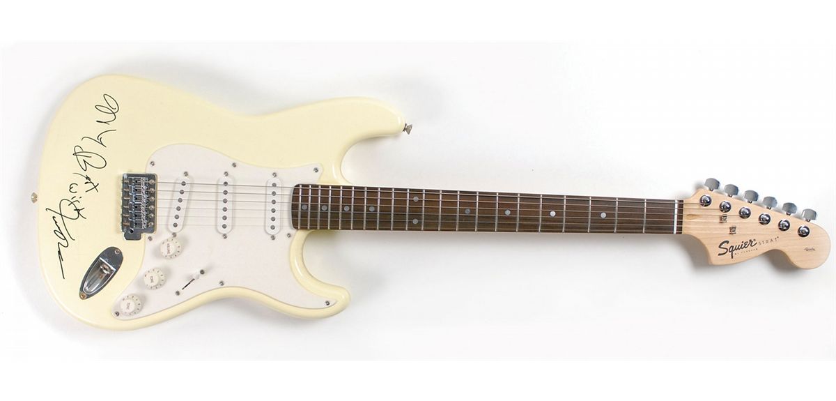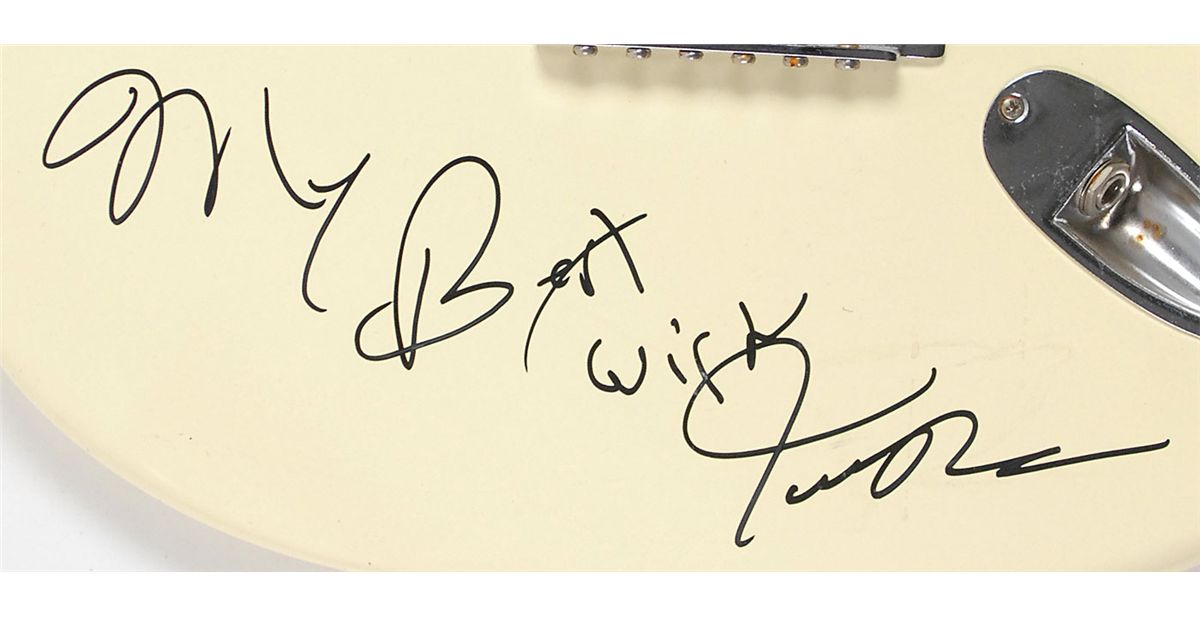 Off-white bodied Fender Squier ‘stratocaster-style’ electric guitar, signed in person on the body in black felt tip, “My best wishes, James Brown.” In fine condition, with some scattered light surface marks to body. Originally obtained by in-person specialist Mike Wehrmann.