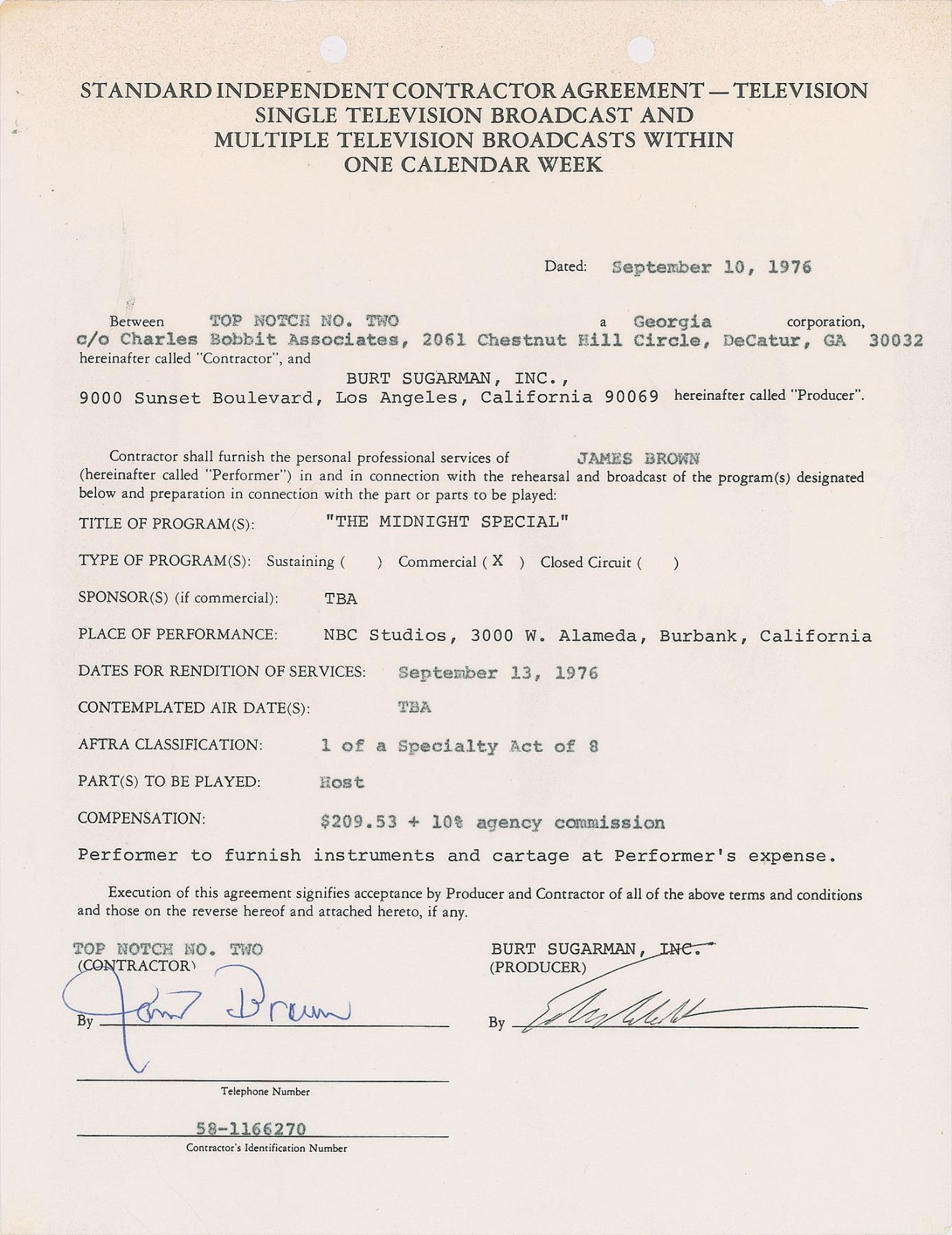 DS, one page, 8.5 x 11, September 10, 1976. Standard Independent Contractor Agreement between Top Notch No. Two and Burt Sugarman, Inc., in which the former agrees to "furnish the professional services of James Brown" for the rehearsal and broadcast of the program "The Midnight Special," on September 13, 1976. Signed at the conclusion in blue ballpoint by Brown. Includes two additional sheets relating to standard terms and conditions. In fine condition.