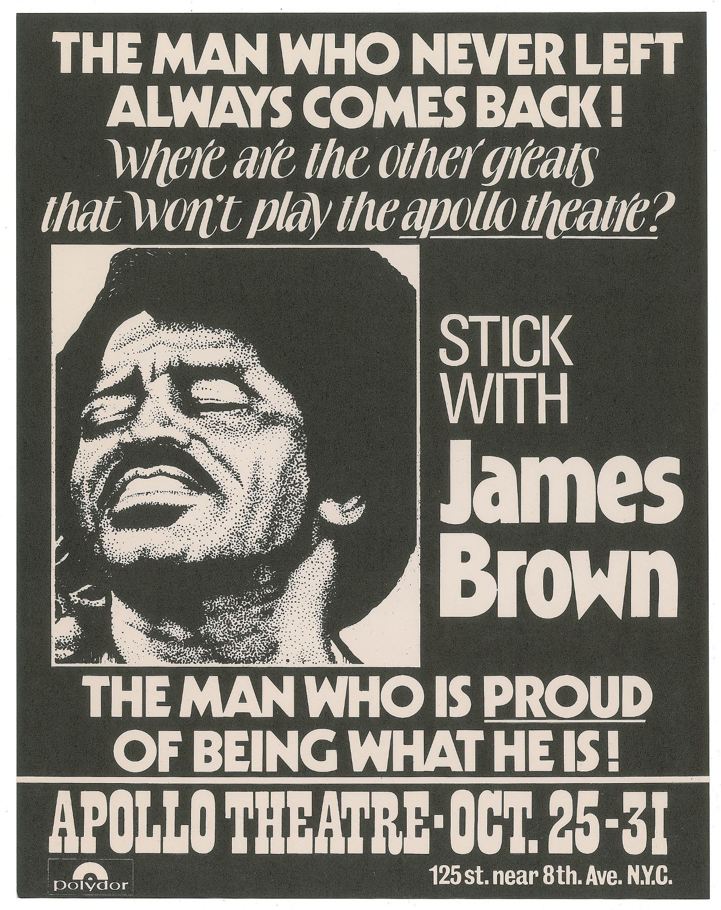 Fantastic original 8.25 x 10.5 handbill for a series of James Brown concerts at Harlem's Apollo Theatre between October 25–31, 1974, with a large image of a mustached Brown and bold white text: "The man who never left always comes back! Where are the other greats that won't play the Apollo Theatre? Stick with James Brown, the man who is proud of being what he is!" In fine condition.