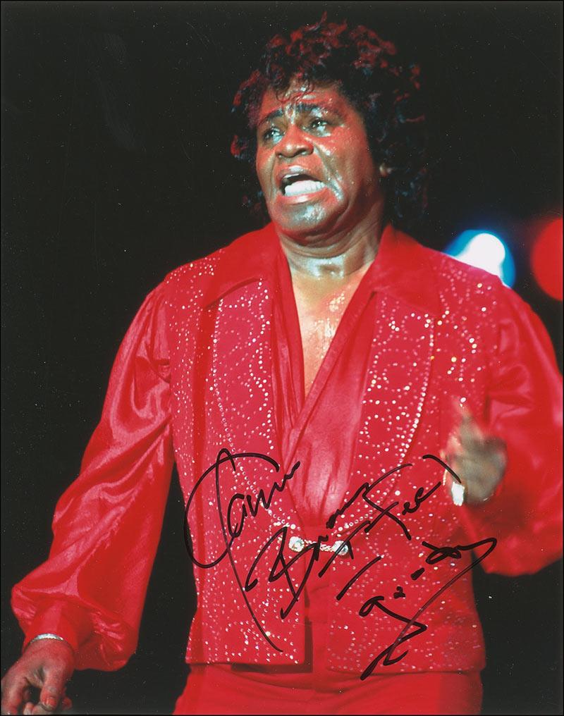 Color glossy 8 x 10 photo of the hardest working man in show business captured during a performance, signed in black felt tip, “James Brown. I feel good.” In fine condition.