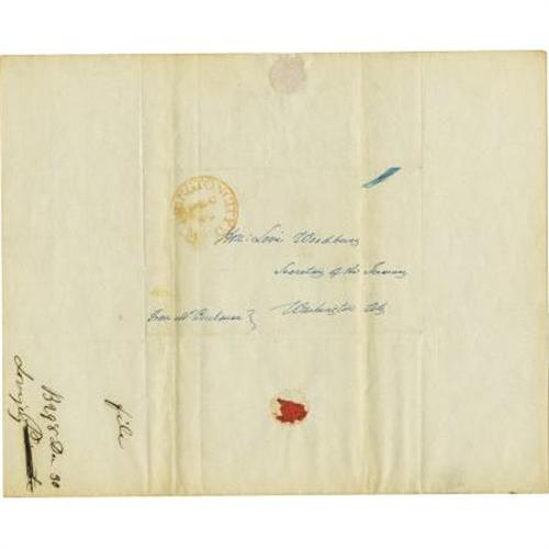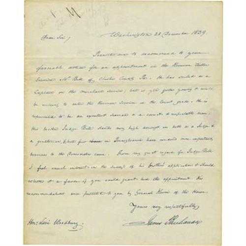 <B>James Buchanan Autograph Letter Signed as Senator.</B></I> ALS "<I>James Buchanan</B></I>", one page, 8" x 10", Washington, Dec. 28, 1839, a letter of recommendation to Secretary of the Treasury<B> Levi Woodbury</B></I>. In part: "<I>Permit me to recommend to your favorable notice for an appointment in the Revenue Cutter Service Mr. Bell of Chester County Pa. He has sailed as a Captain in the merchant service; but is yet quite young & would be willing to enter... in the lowest grade... His brother Judge Bell stands very high amongst us both as a Judge & a gentleman, & but few in Pennsylvania have rendered more important services to the Democratic cause...</B></I>" <I> </B></I> Conjoined sheet includes address panel addressed in Buchanan's hand and containing a second signature: "<I>From Mr. Buchanan</B></I>". Woodbury's pencil docketing is at top left and is initialed "<I>W</B></I>". Usual folds, near fine.<BR><BR><b>Shipping:</b> Flat Material, Small (<a target="_blank" href="http://www.heritageauctions.com/common/shipping.php">view shipping information</a>)
