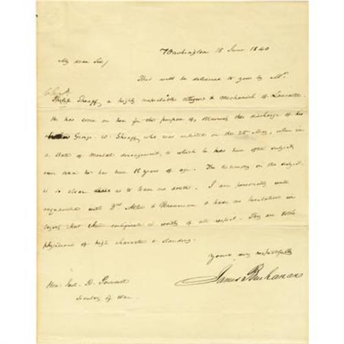 <B>James Buchanan Autograph Letter Signed as Senator.</B></I> One page, 7.5" x 9.5", Washington, June 18, 1840 to Joel Roberts Poinsett, Secretary of War, on behalf of Mr. Chas Sheaff, requesting the military discharge of his son George W. Sheaff. He writes, in part: "<I>This will be delivered...for the purpose of obtaining the discharge of...George W. Sheaff who has enlisted...in a state of Mental derangement to which he has been...since he has been 18 years of age. The testimony on this subject is so clear as to leave no doubt.</B></I>" Usual folds, else fine. <I>Ex. Henry E. Luhrs Collection.</B></I><BR><BR><BR><b>Shipping:</b> Flat Material, Small (<a target="_blank" href="http://www.heritageauctions.com/common/shipping.php">view shipping information</a>)