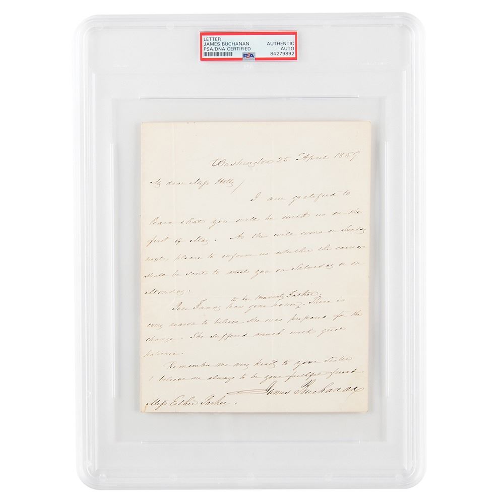 ALS as president, one page, 6.25 x 8, April 25, 1859. Handwritten letter to "Miss Hetty," his housekeeper, Edith Parker, in full: “I am grateful to learn that you will be with us on the first of May. As this will come on Sunday next, please to inform us whither the carriage shall be sent to meet you on Saturday or on Monday. Poor Fanny had gone home to her Heavenly Father. There is every reason to believe she was prepared for the change. She suffered much with great patience. Remember me very kindly to your Sister & believe me always to be your faithful friend.†In fine condition. Encapsulated in a PSA/DNA authentication holder.