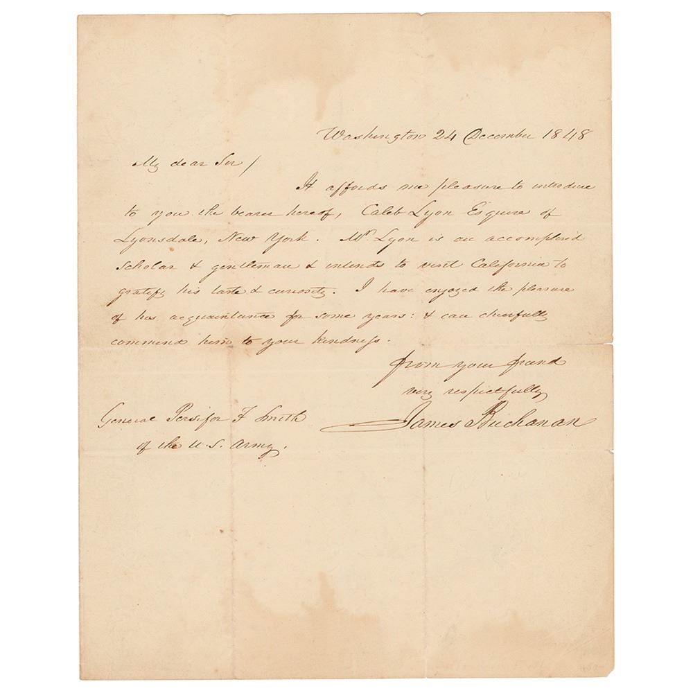 ALS, one page, 8 x 10, December 24, 1848. Handwritten letter to General Persifor Frazer Smith, one of the last military governors of California. In full: "It affords me pleasure to introduce to you the bearer hereof, Caleb Lyon Esquire of Lyonsdale, New York. Mr. Lyon is one accomplished scholar & gentleman & intends to visit California to gratify his taste & curiosity. I have enjoyed the pleasure of his acquaintance for some years: & can cheerfully command him to your kindness." In very good to fine condition, with a split to the end of the central horizontal fold, and faint staining to the upper and lower blank areas.