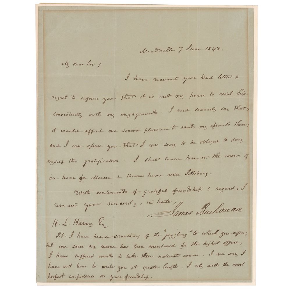 ALS, one page, 8.25 x 10.5, June 7, 1843. Handwritten letter to H. L. Harvey, in part: "I have received your kind letter & regret to inform you that it is not in my power to visit Erie consistently with my engagements. I need scarcely say that it would afford me great sincere pleasure to meet my friends there; and I can assure you that I am sorry to be obliged to deny myself this gratification‰Û_P.S. I have heard something of the 'juggling' to which you refer; but ever since my name was mentioned for the highest office, I have suffered events to take their natural course. I am sorry I have not time to write you at greater length. I rely with the most perfect confidence on your friendship." Affixed by its top edge to a slightly larger mount. In fine condition, with toning from prior display. At this time, Buchanan was serving as a senator from Pennsylvania; he would then serve as secretary of state from 1845 to 1849, and took the nation's highest office in 1857.