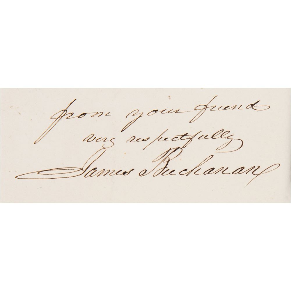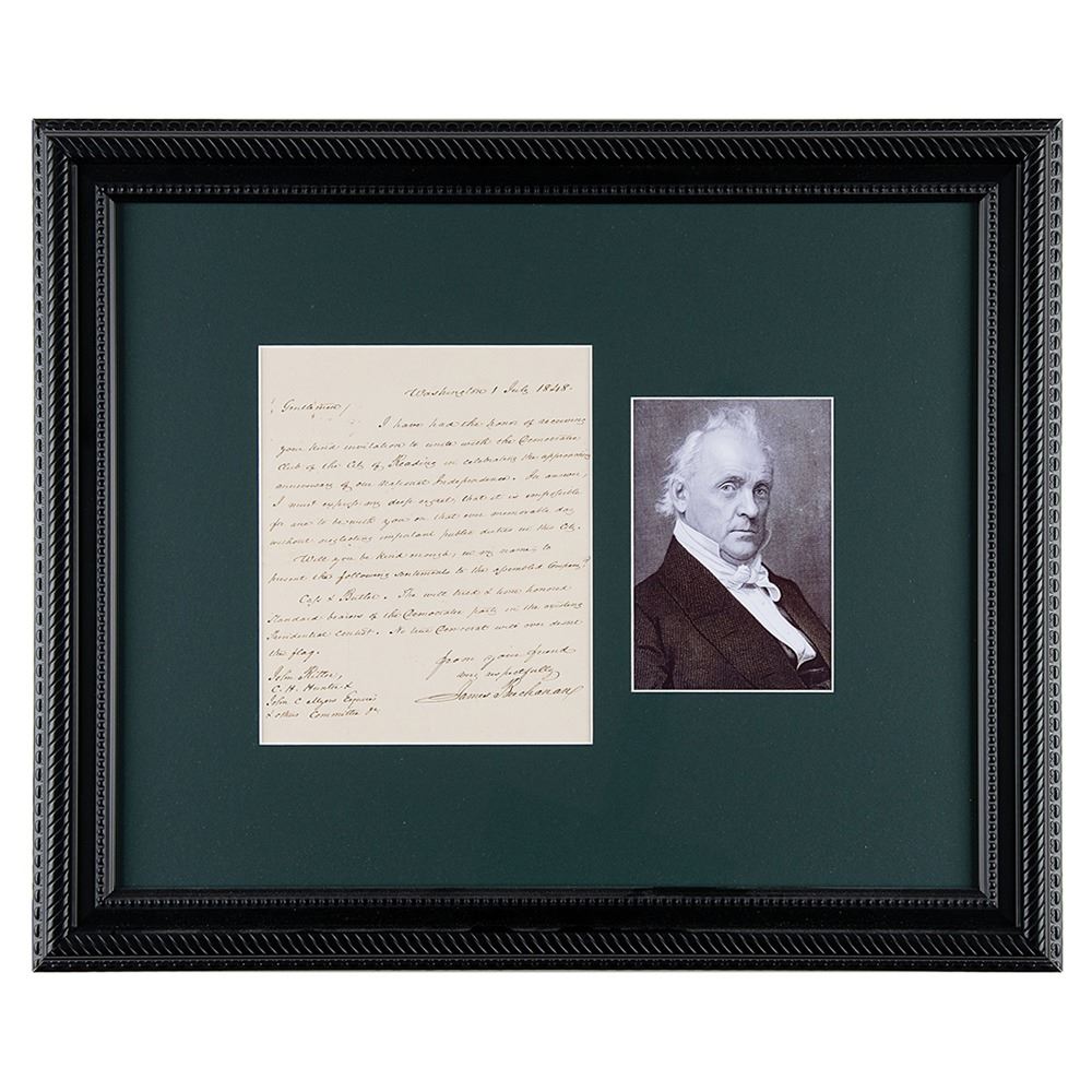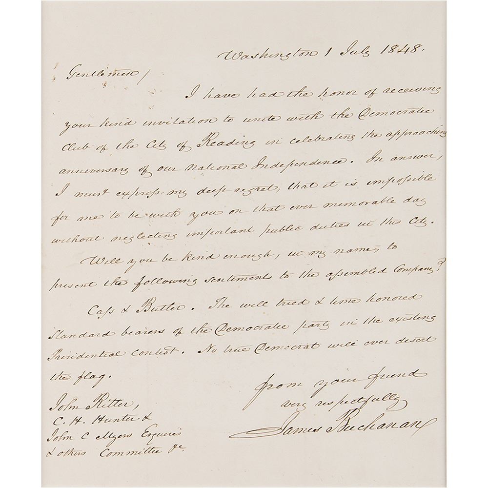 ALS as secretary of state, one page, 7.5 x 9, July 1, 1848. Written from Washington, a letter to John Ritter, C. H. Hunter, John C. Meyers, and other members of Pennsylvania's Democratic Party. In full: "I have had the honor of receiving your kind invitation to unite with the Democratic Club of the City of Reading in celebrating the approaching anniversary of our national Independence. In answer, I must express my deep regret, that it is impossible for me to be with you on that ever memorable day without neglecting important public City. Will you be kind enough, in my name, to present the following sentiment to the assembled Company? Cass & Butler. The well tried & time honored standard bearers of the Democratic party in the existing Presidential contest. No true Democrat will ever desert the flag." Nicely matted and framed with a portrait to an overall size of 23.5 x 19.5. In fine condition. Buchanan had just been rebuked in his attempt at the Democratic presidential nomination, and here mends political fences by offering a sentiment in support of the Lewis Cass/William O. Butler presidential ticket. A highly desirable, neatly penned letter by the future commander-in-chief.