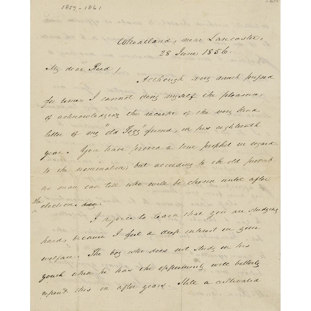ALS, one page both sides, 6.5 x 8, June 28, 1856. Handwritten letter to a young friend and supporter, commenting on his recent nomination for president and offering advice. In part: "You have proved a true prophet in regard to the nomination; but according to the old proverb, no man can tell who will be chosen until after the election. I rejoice to learn that you are studying hard, because I feel a deep interest in your welfare. The boy who does not study in his youth when he has the opportunity will bitterly resent this in after years. Still a cultivated intellect without health to make it effective will be of no use to the possessor himself or to the world. Exercise & moderate recreation are necessary to the formation of a vigorous constitution & these you ought by no means to neglect." In fine condition. Having been named the Democratic Party's candidate for president in early June, Buchanan would go on to win the presidential election in November.