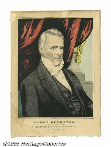 <B>James Buchanan Campaign Print by Currier</B></I> 10" x 14" hand-colored small folio lithograph published by Nathaniel Currier in 1856, titled "James Buchanan, Democratic Candidate for Fifteenth President of the United States." The Democratic nominee is pictured in the standard pose beneath tasseled draperies. Colors are vibrant, including scarlet, yellow, emerald and powder blue. Condition is very nice with some minor dampstains in the lower left corner and top margin. Lot:256