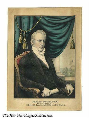 <B>James Buchanan Campaign Print by Kellogg</B></I> 10" x 14" hand-colored small folio lithograph published by Kellogg in Hartford in 1856, titled "James Buchanan, Democratic Candidate for Fifteenth President of the United States." The rather docile and relaxed Pennsylvanian appears in the Presidential chair with the Capitol in the background. The artist made him look younger and thinner than he actually was. Colors are vibrant. The paper is evenly, but lightly toned, consistent with its age. Overall appearance is quite nice. Lot:256